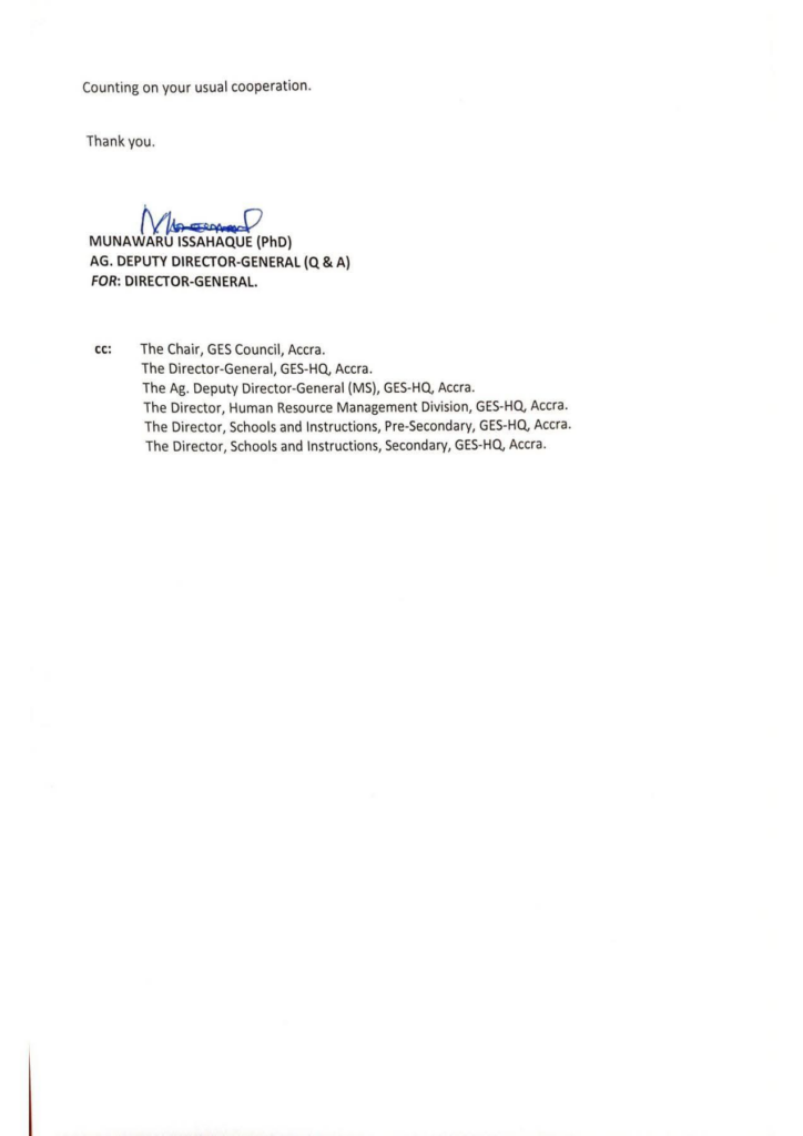 Management further warned that any teacher who leaves their duty post to visit the GES headquarters or is recorded speaking to the media during official working hours will be considered absent from duty, in line with provisions of the GES Code of Conduct.
